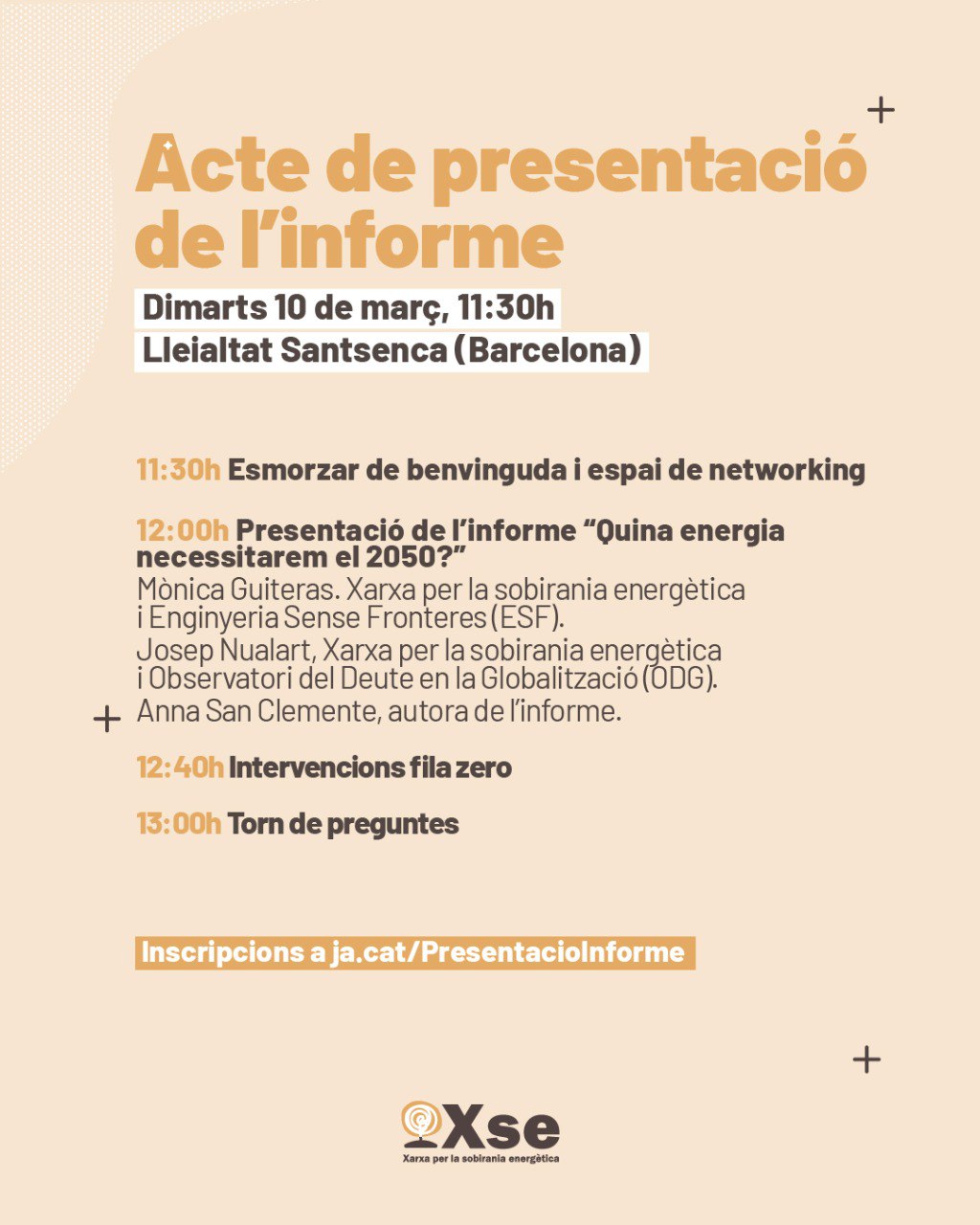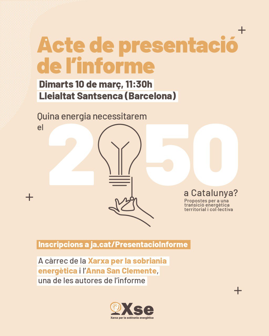 Per respondre a aquestes preguntes, des de la Xarxa per la sobirania energètica (Xse) hem passat els darrers mesos modelitzant dades i dibuixant escenaris. El resultat és l’informe “Quina energia necessitarem el 2050 a Catalunya?”, que presentarem públicament el proper dimarts 10 de març a la Lleialtat Santsenca (Barcelona).