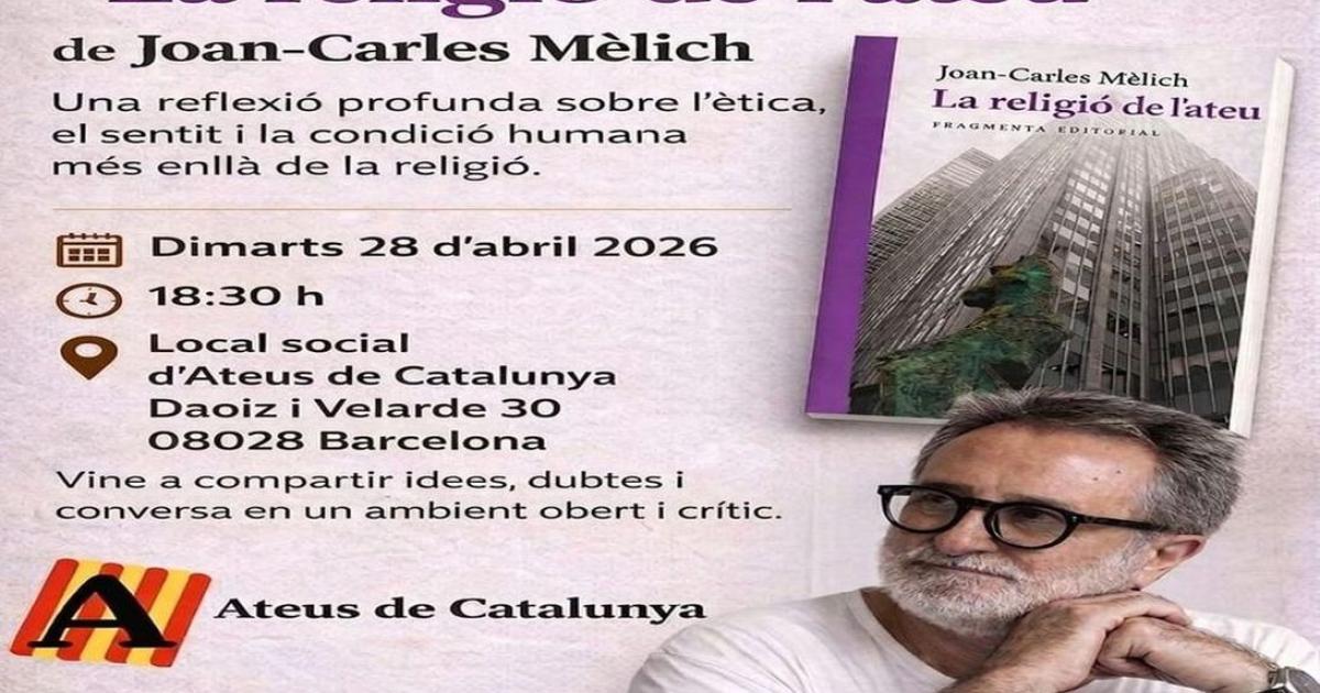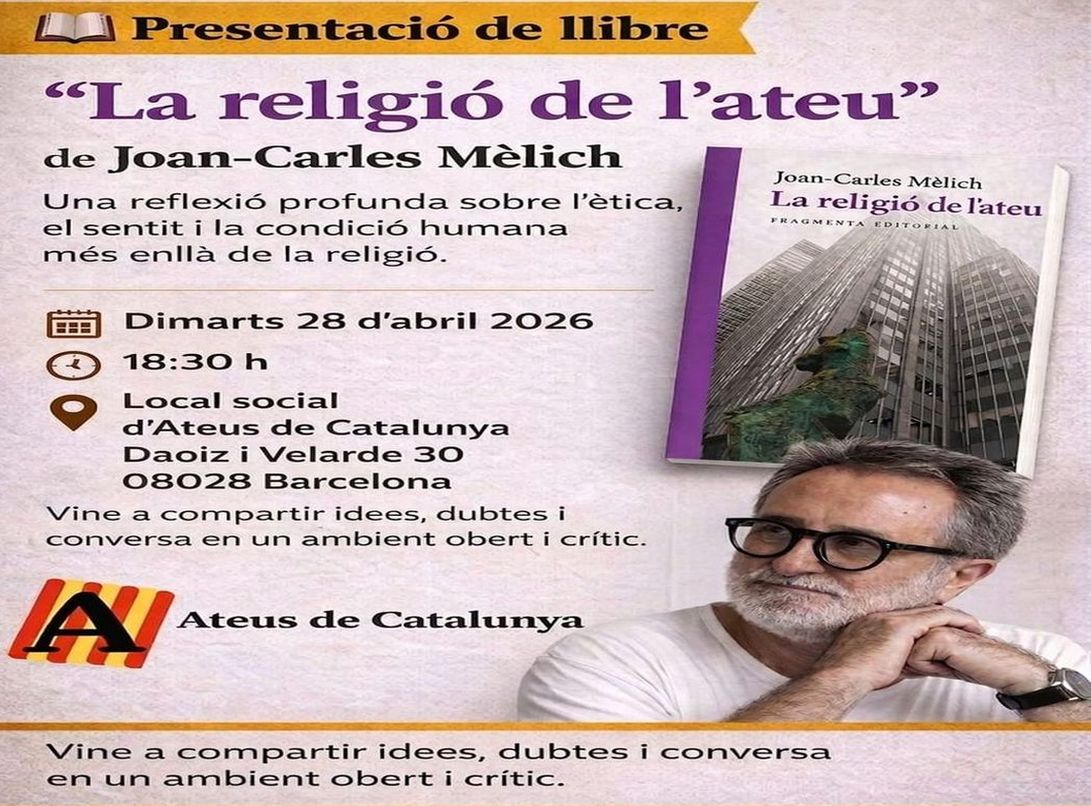Data inici * dt., 28/04/2026 - 18:30 Districte i barri * Sants-Montjuïc Presentació del llibre "La religió de l'ateu" de Joan-Carles Mèlich Organitza Ateus de Catalunya Una reflexió profunda sobre l'ètica, el sentit i la condició humana més enllà de la religió. Vine a compartir idees, dubtes i conversa en un ambient obert i crític.