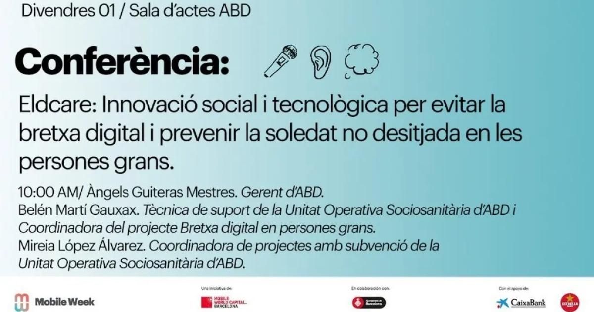 El proper 1 d’abril de 10 a 11h, l’Associació Benestar i Desenvolupament ABD, participa a la 6a edició de Mobile Week Barcelona. Sota el títol Eldcare: innovació social i tecnològica per evitar la bretxa digital i prevenir la soledat no desitjada en les persones grans, l’equip de la Unitat Operativa Sociosanitària mostrarà els usos i aplicacions del dispositiu Eldcare per no deixar les persones grans enrere i prevenir l’aïllament. L’acte tindrà lloc a la seu d’ABD al carrer Quevedo 2, baixos, de Barcelona.