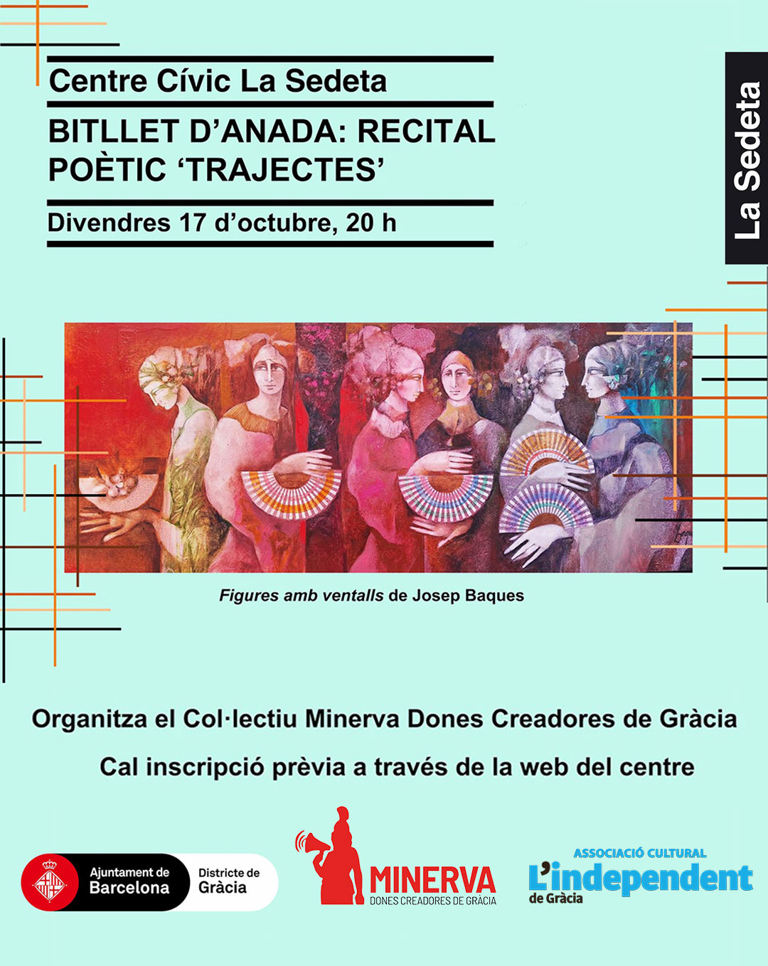 Divendres 17 d’octubre, a les 20.00 h, tindrà lloc al Centre Cívic La Sedeta, el recital poètic ‘Trajectes’ que organitzem des del col·lectiu Minerva Dones Creadores de Gràcia (MDCG).