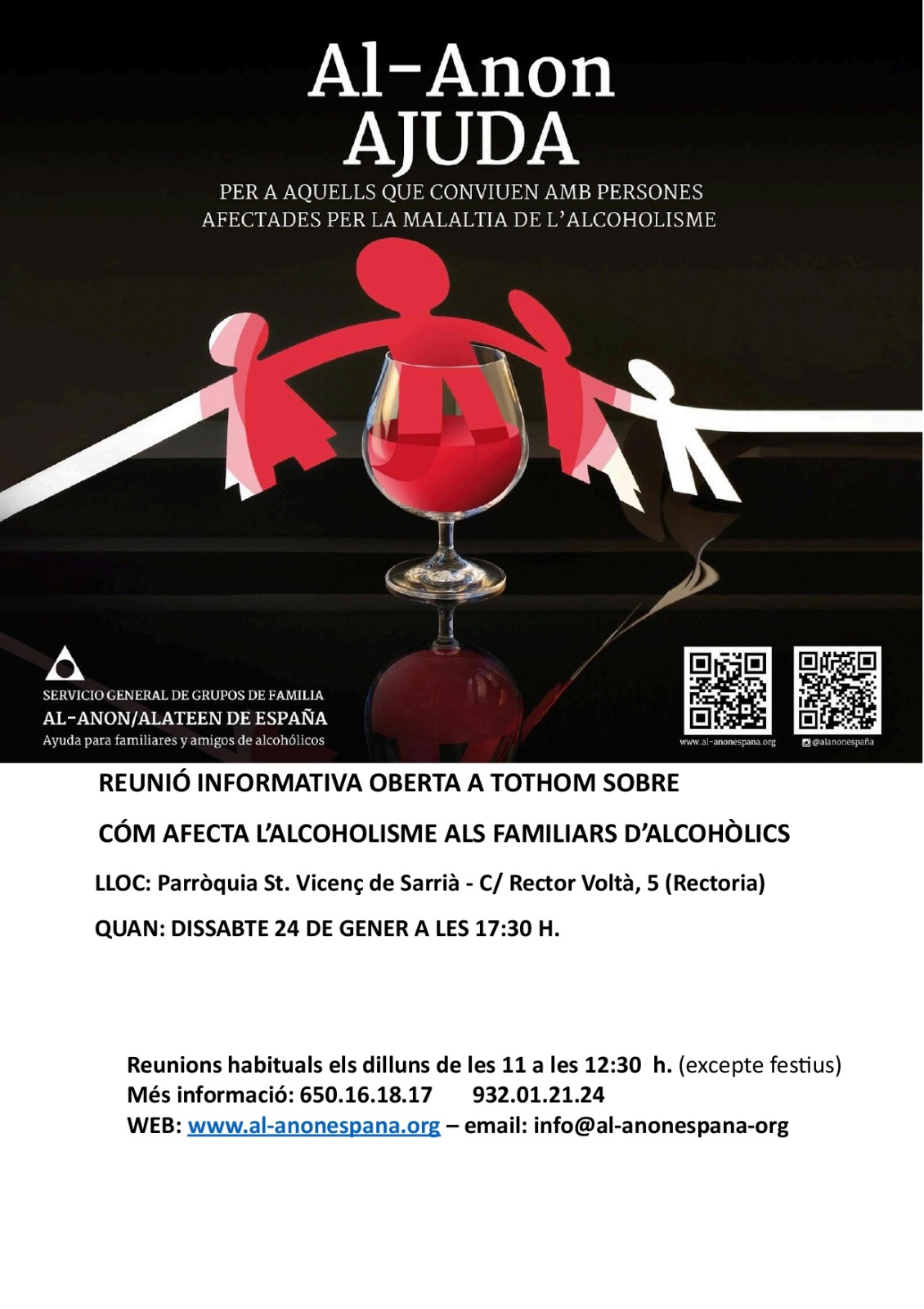 Reunió oberta per a informar a totes les persones que puguin estar afectades per la convivència amb un familiar o amic intim, malalt per l'alcoholisme.