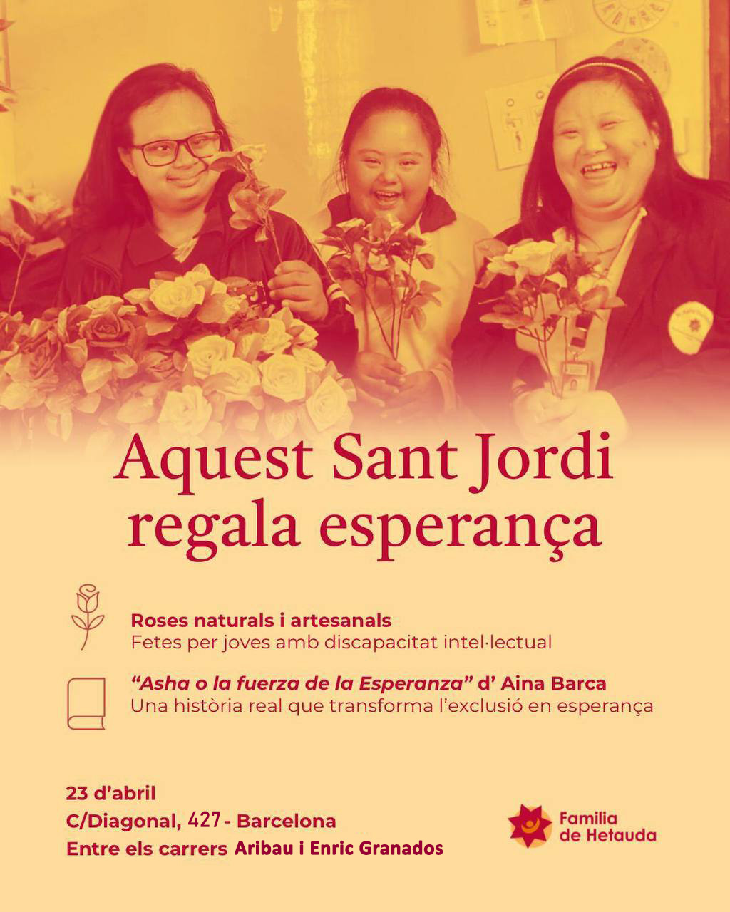 Aquest Sant Jordi, regala esperança tot comprant una rosa artesanal o un llibre a Família d'Hetauda al C/Diagonal 427.
