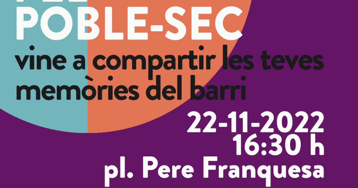 Districte i barri * Sants-Montjuïc RUTA PARTICIPATIVA GRATUITA Organitza Fem Memòria En col·laboració amb Tata Inti SCCL Ruta Participativa pel Poble-sec Descobrirem algunes històries del barri a partir de la Plaça Pere Franquesa i compartirem les nostres per a construir una memòria col·lectiva i compartida