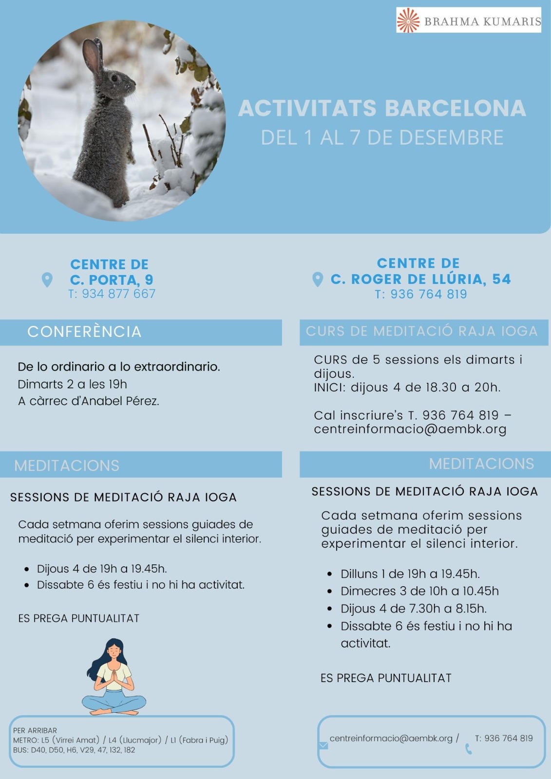Data inici * dl., 01/12/2025 - 19:00 Districte * Nou Barris Sessions de Meditació Raja Ioga del 1 al 7 de desembre Organitza Associació Brahma Kumaris Sessions per aprofundir en l'experiència del silenci i l'autoconeixement a través de la pràctica de la meditació Raja Ioga. Per a més informació veure cartell adjunt.