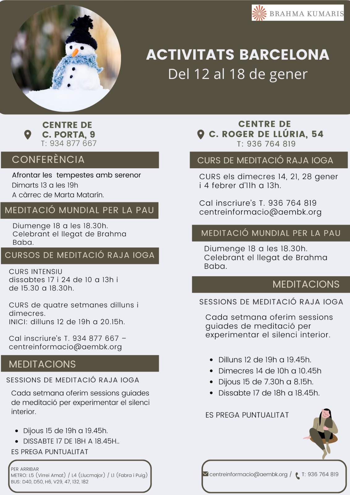 Data inici * dl., 12/01/2026 - 17:00 Districte i barri * Nou Barris Sessions de Meditació Raja Ioga del 12 al 18 de gener Organitza Associació Brahma Kumaris Sessions per aprofundir en l'experiència del silenci i l'autoconeixement a través de la pràctica de la meditació Raja Ioga. Per a més informació veure cartell adjunt.