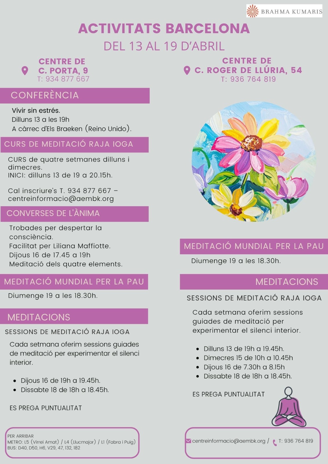 Data inici * dl., 13/04/2026 - 17:00 Districte i barri * Nou Barris Sessions de Meditació Raja Ioga del 13 al 19 d'abril Organitza Associació Brahma Kumaris Sessions per aprofundir en l'experiència del silenci i l'autoconeixement a través de la pràctica de la meditació Raja Ioga. Per a més informació veure cartell adjunt.