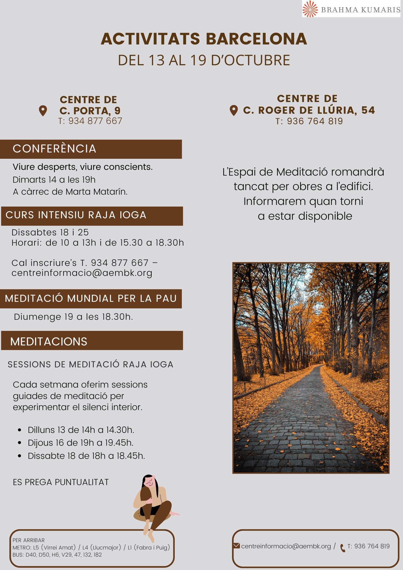 Data inici * dl., 13/10/2025 - 14:00 Districte * Nou Barris Sessions de Meditació Raja Ioga del 13 al 19 d'octubre Organitza Associació Brahma Kumaris Sessions per aprofundir en l'experiència del silenci i l'autoconeixement a través de la pràctica de la meditació Raja Ioga. Per a més informació veure cartell adjunt.