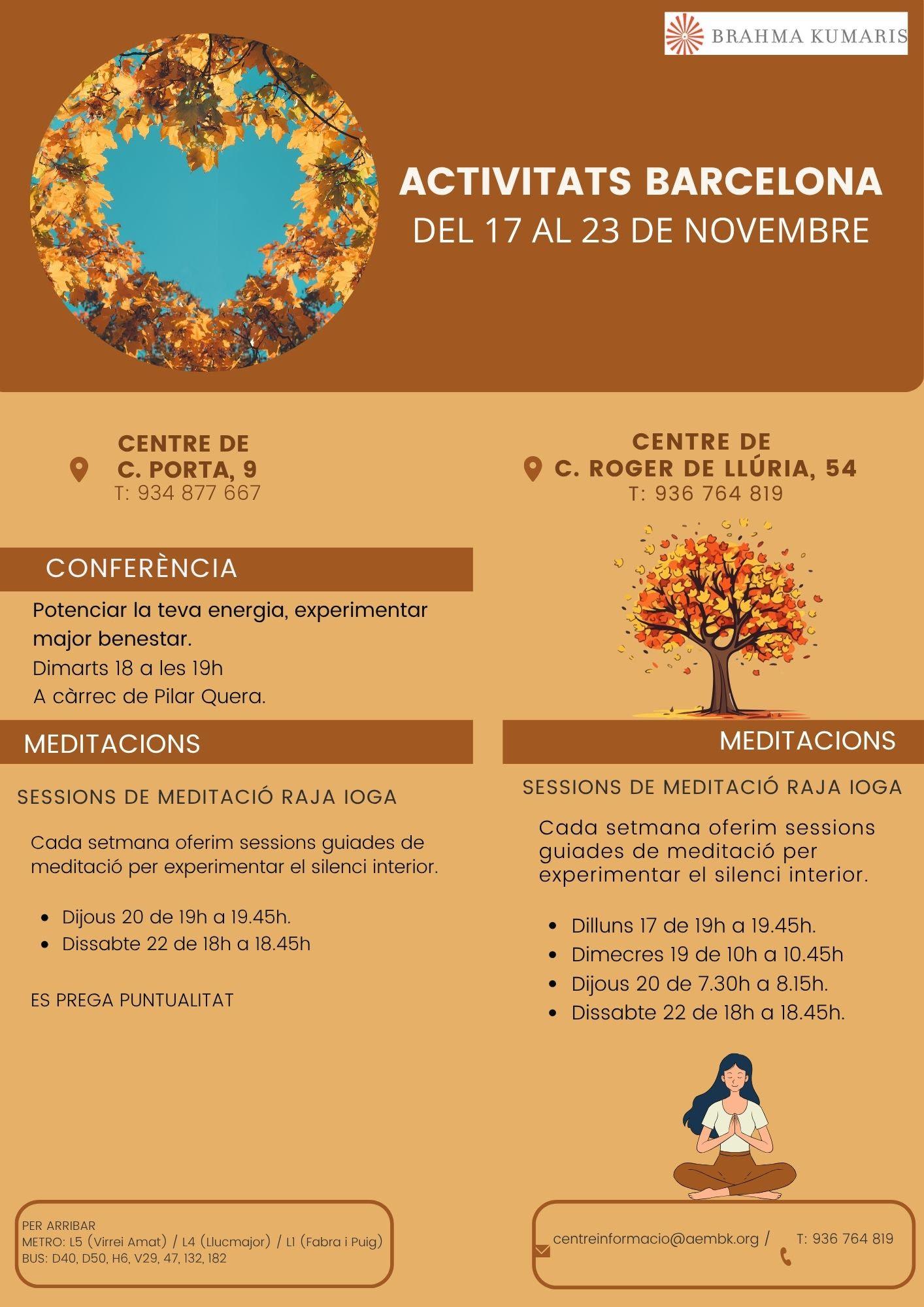 Data inici * dt., 18/11/2025 - 19:00 Districte * Nou Barris Sessions de Meditació Raja Ioga del 17 al 22 de novembre Organitza Associació Brahma Kumaris Sessions per aprofundir en l'experiència del silenci i l'autoconeixement a través de la pràctica de la meditació Raja Ioga. Per a més informació veure cartell adjunt.