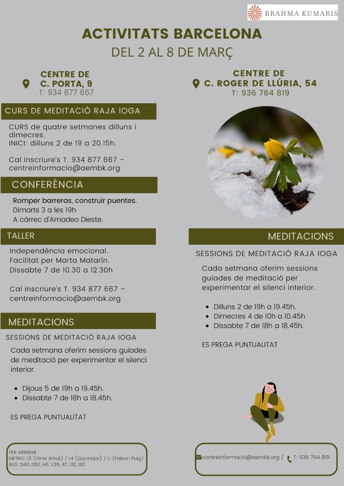 Data inici * dl., 02/03/2026 - 19:00 Districte i barri * Eixample Sessions de Meditació Raja Ioga del 2 al 7 de març Organitza Associació Brahma Kumaris Sessions per aprofundir en l'experiència del silenci i l'autoconeixement a través de la pràctica de la meditació Raja Ioga. Per a més informació veure cartell adjunt.