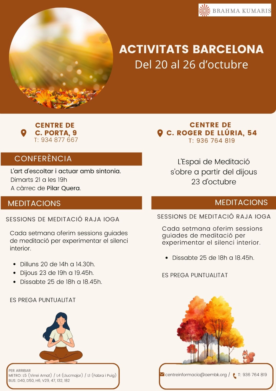 Data inici * dl., 20/10/2025 - 14:00 Districte * Nou Barris Sessions de Meditació Raja Ioga del 20 al 25 d'octubre Organitza Associació Brahma Kumaris Sessions per aprofundir en l'experiència del silenci i l'autoconeixement a través de la pràctica de la meditació Raja Ioga. Per a més informació veure cartell adjunt.