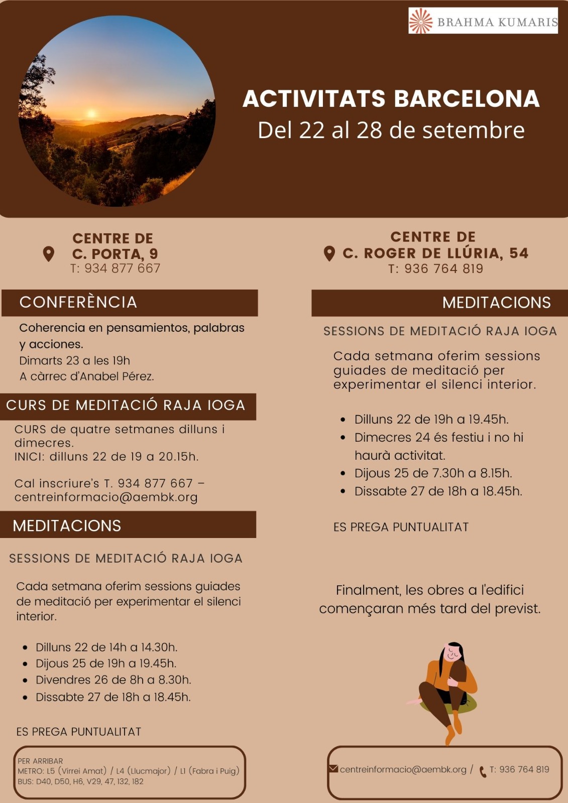 Data inici * dl., 22/09/2025 - 19:00 Districte * Eixample Sessions de Meditació Raja Ioga del 22 al 27 de setembre Organitza Associació Brahma Kumaris Sessions per aprofundir en l'experiència del silenci i l'autoconeixement a través de la pràctica de la meditació Raja Ioga. Per a més informació veure cartell adjunt.