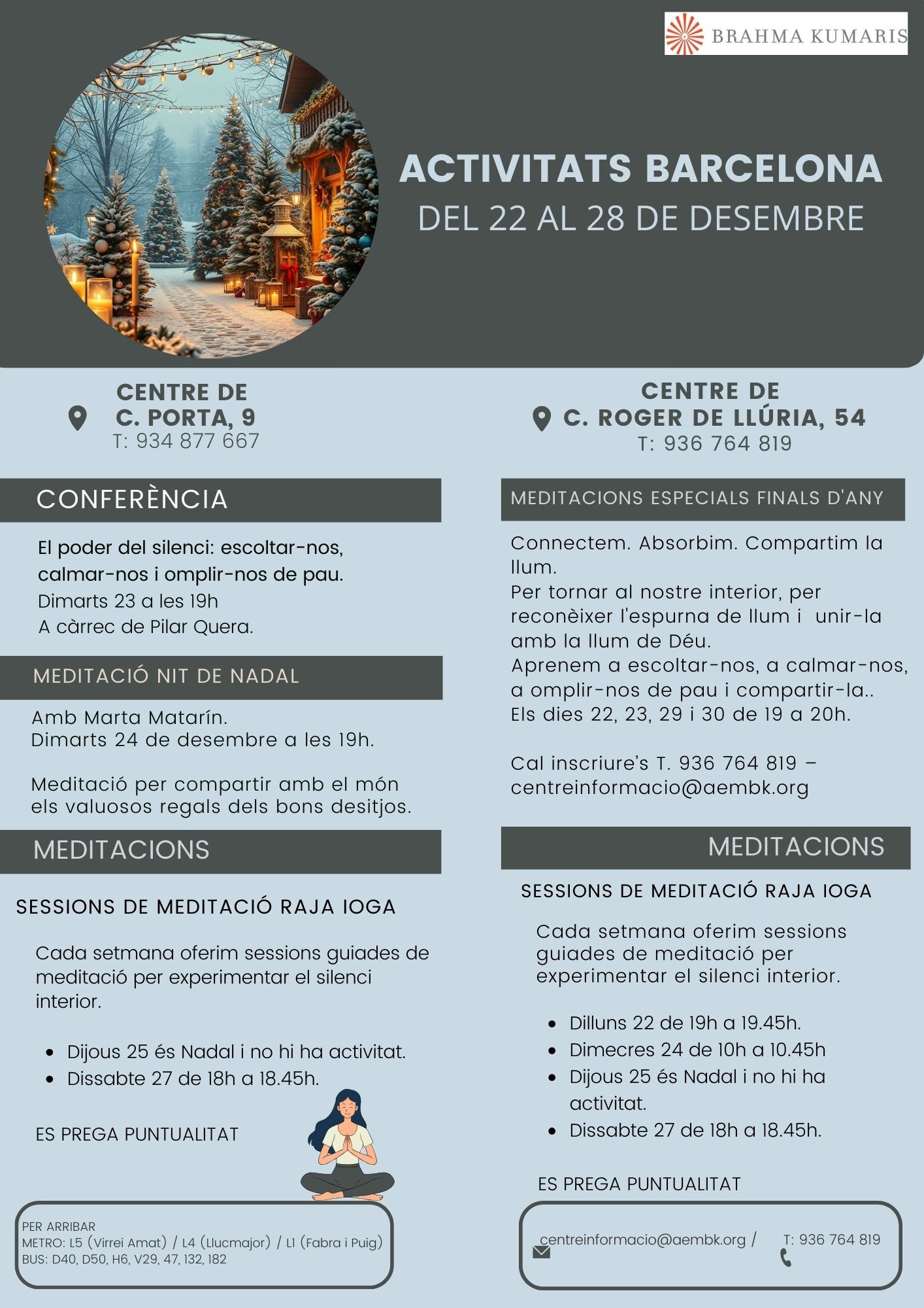 Data inici * dl., 22/12/2025 - 17:00 Districte i barri * Nou Barris Sessions de Meditació Raja Ioga del 22 al 28 de desembre Organitza Associació Brahma Kumaris Sessions per aprofundir en l'experiència del silenci i l'autoconeixement a través de la pràctica de la meditació Raja Ioga. Per a més informació veure cartell adjunt.