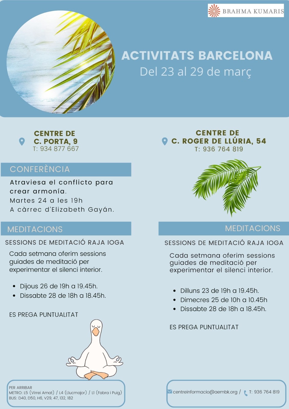 Data inici * dl., 23/03/2026 - 17:00 Districte i barri * Nou Barris Sessions de Meditació Raja Ioga del 23 al 28 de març Organitza Associació Brahma Kumaris Sessions per aprofundir en l'experiència del silenci i l'autoconeixement a través de la pràctica de la meditació Raja Ioga. Per a més informació veure cartell adjunt.
