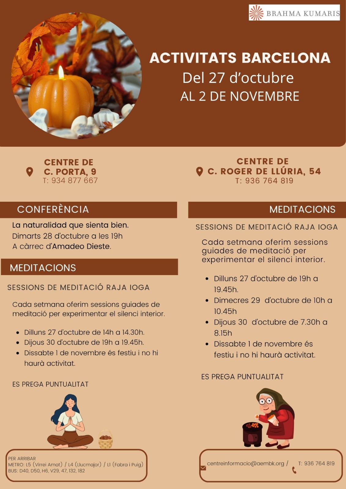 Data inici * dl., 27/10/2025 - 14:00 Districte * Nou Barris Sessions de Meditació Raja Ioga del 27 al 30 d'octubre Organitza Associació Brahma Kumaris Sessions per aprofundir en l'experiència del silenci i l'autoconeixement a través de la pràctica de la meditació Raja Ioga. Per a més informació veure cartell adjunt.