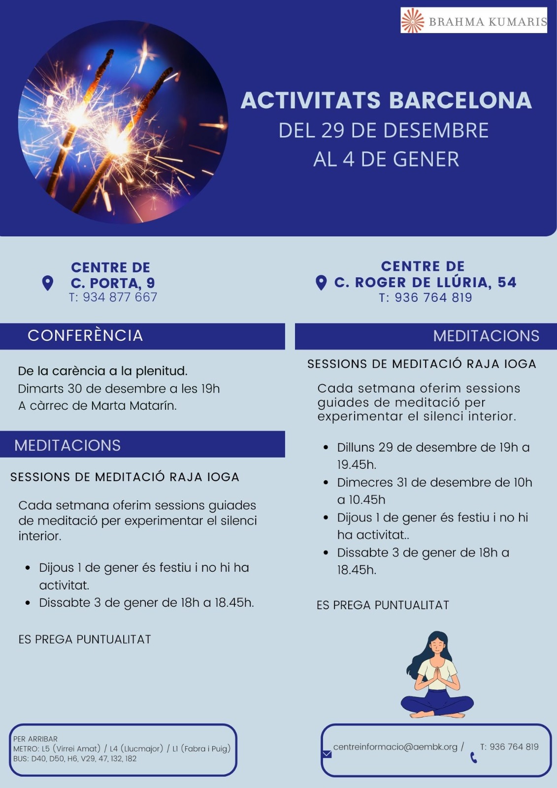 Data inici * dl., 29/12/2025 - 17:00 Districte i barri * Nou Barris Sessions de Meditació Raja Ioga del 29 de desembre al 3 de gener Organitza Associació Brahma Kumaris Sessions per aprofundir en l'experiència del silenci i l'autoconeixement a través de la pràctica de la meditació Raja Ioga. Per a més informació veure cartell adjunt.