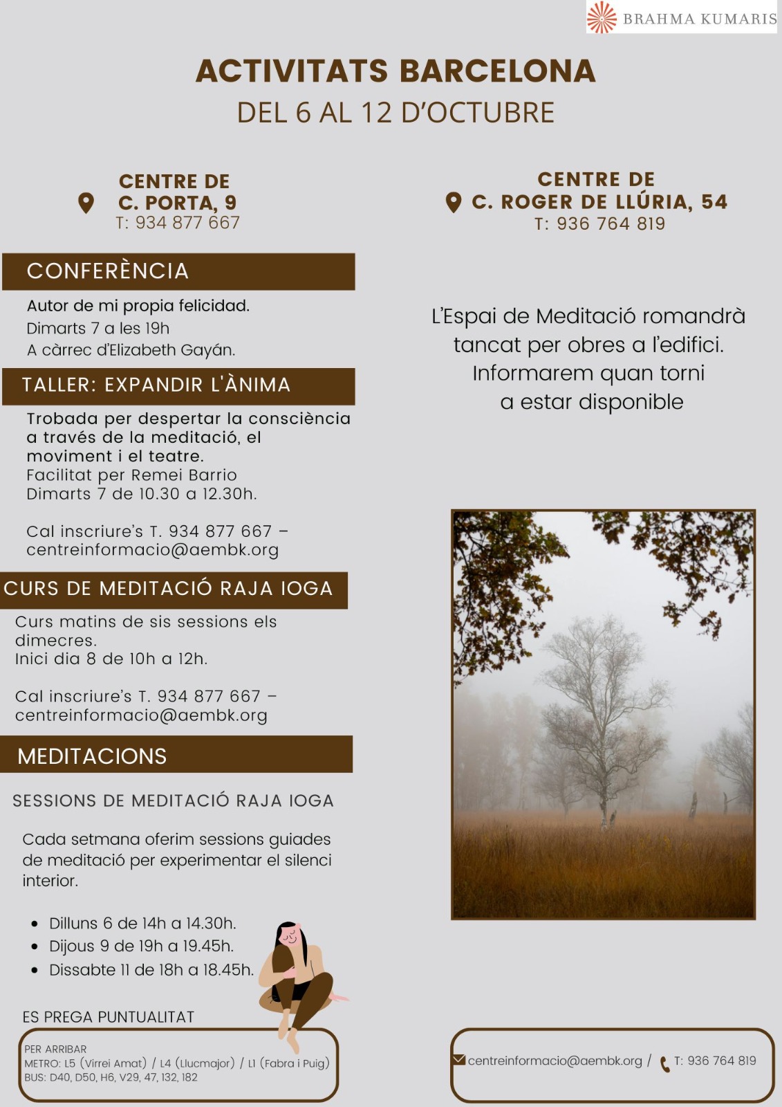 Data inici * dl., 06/10/2025 - 14:00 Districte * Nou Barris Sessions de Meditació Raja Ioga del 6 al 11 d'octubre Organitza Associació Brahma Kumaris Sessions per aprofundir en l'experiència del silenci i l'autoconeixement a través de la pràctica de la meditació Raja Ioga. Per a més informació veure cartell adjunt.