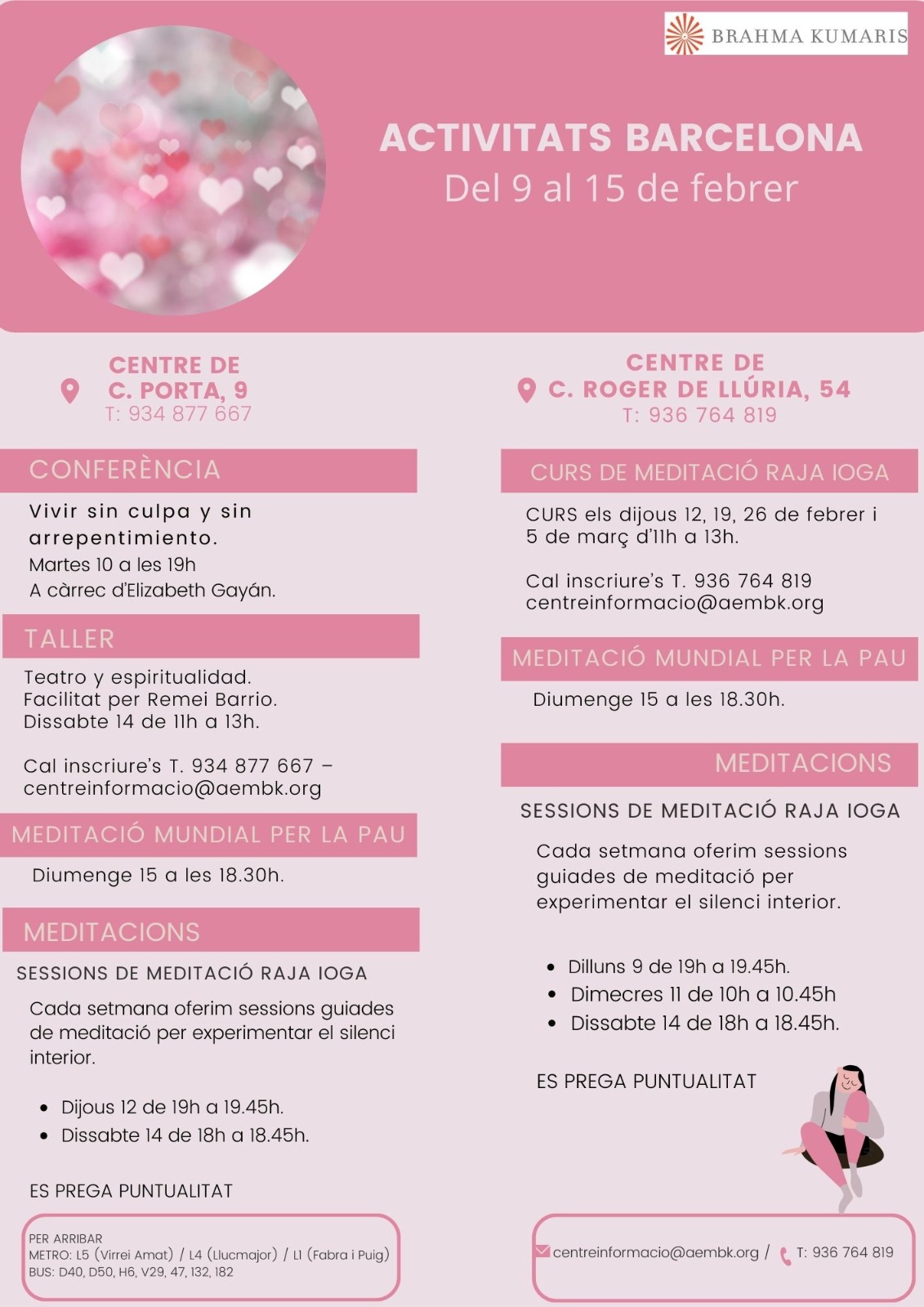Data inici * dl., 09/02/2026 - 17:00 Districte i barri * Nou Barris Sessions de Meditació Raja Ioga del 9 al 15 de febrer Organitza Associació Brahma Kumaris Sessions per aprofundir en l'experiència del silenci i l'autoconeixement a través de la pràctica de la meditació Raja Ioga. Per a més informació veure cartell adjunt.