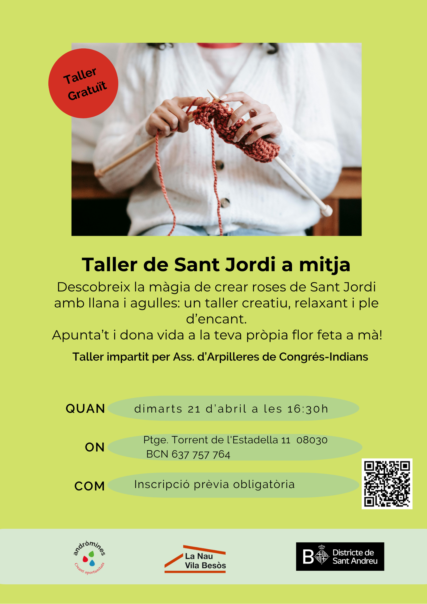 Data inici * dt., 21/04/2026 - 16:30 Districte i barri * Sant AndreuEl Bon Pastor St. JORDI FET A MITJA Organitza La Nau Vila Besòs Taller de mitja Un ofici, una cultura, un hobby, li diguis com li diguis vine i aprèn a fer mitja!Només has de portar 2 agulles de mitja per crear les teves flors! Aquest taller requereix de material propi.
