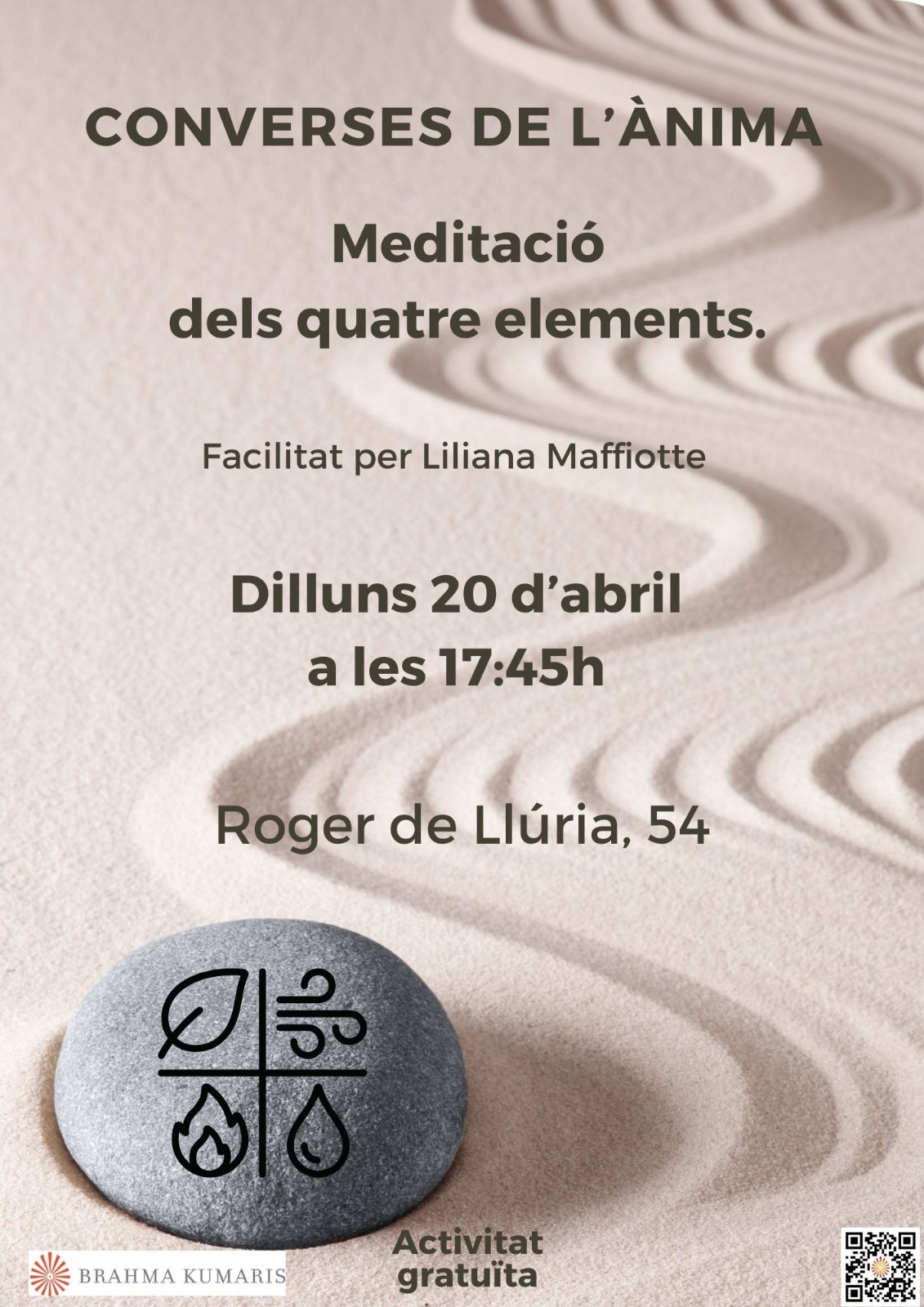 Data inici * dl., 20/04/2026 - 17:45 Districte i barri * Eixample Taller - Converses de l'ánima: Meditació dels quatre elements Organitza Associació Brahma Kumaris Reflexionem plegats per aprendre i créixer. Reflexions i experiència de meditació.