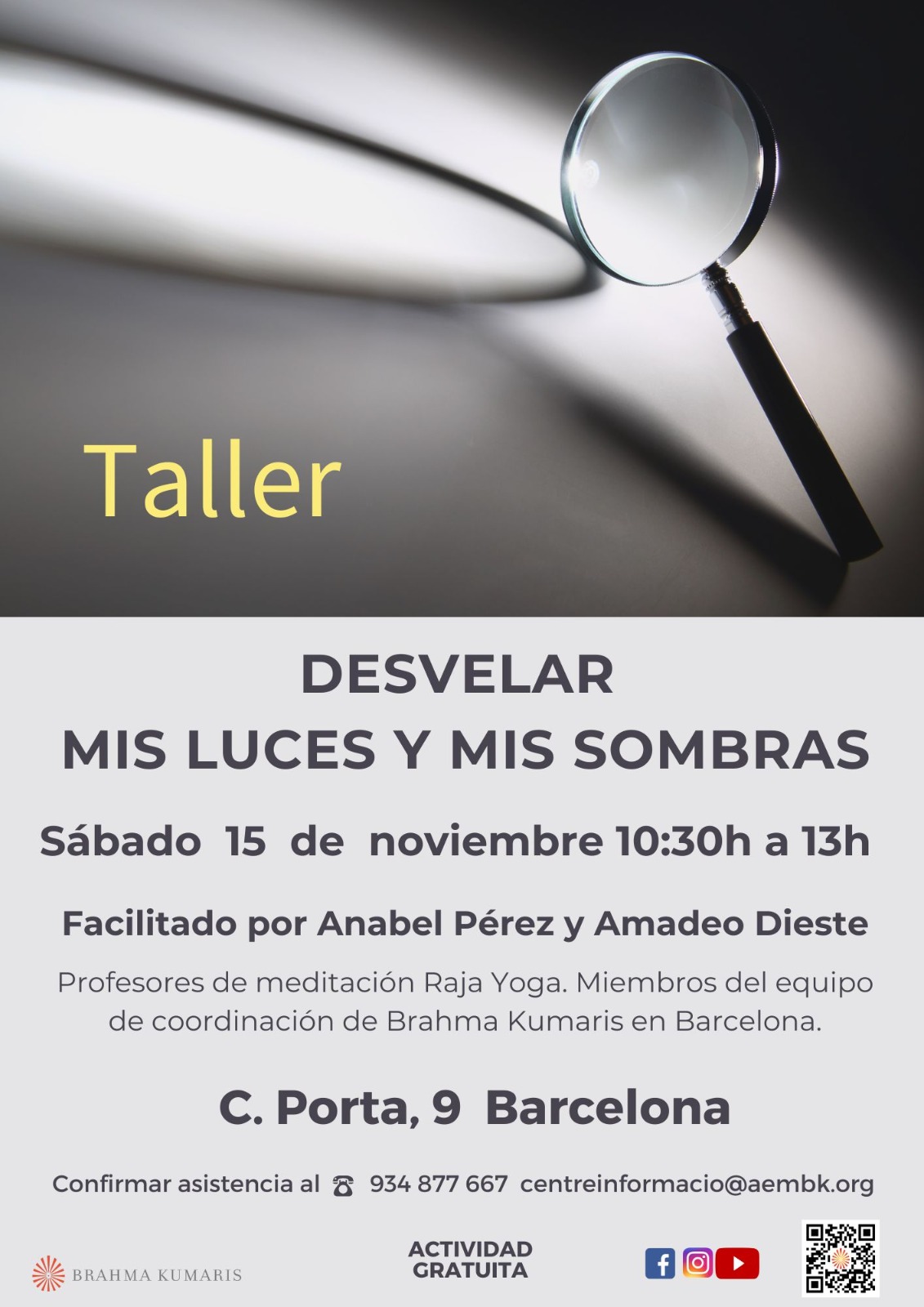 Data inici * ds., 15/11/2025 - 10:30 Districte * Nou Barris Taller: Desvelar les meves llums i les meves ombres Organitza Associació Brahma Kumaris Reconéixer les fortaleses i deixar anar les debilitats. Reflexions i meditació