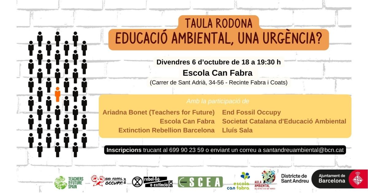 Comptarem amb la veu de professionals del sector de l’educació ambiental, activistes pel clima, investigadors/es i professors/es d’escola i institut que aportaran la seva experiència i visió en una taula rodona, de ben segur constructiva: Ariadna Bonet (Teachers For Future), Lluís Sala (professor d’ESO), Escola Can Fabra, associació Societat Catalana d’Educació Ambiental (SCEA), End Fossil Barcelona i Extinction Rebellion.