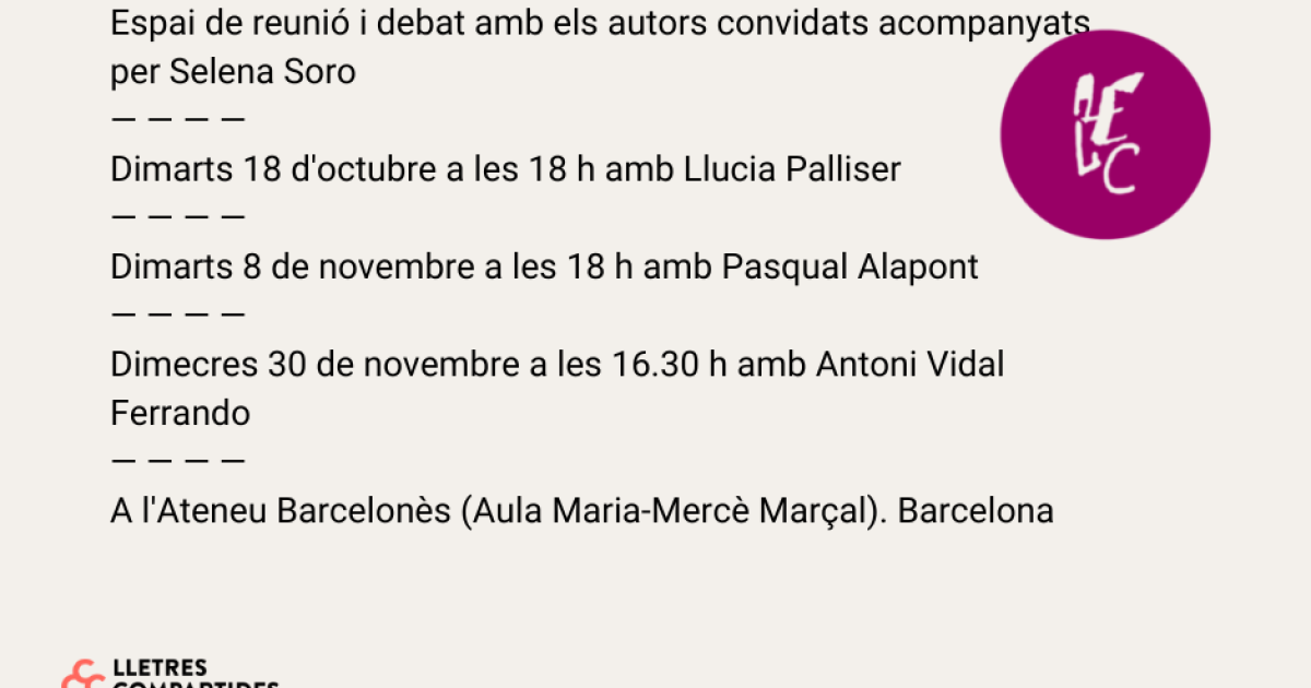 Les trobades, que es faran a l'Ateneu Barcelonès (Aula Maria-Mercè Marçal), comptaran amb la participació de la directora de la Institució de les Lletres Catalanes, Izaskun Arretxe, i del president de l'AELC, Sebastià Portell. També en formarà part Selena Soro, escriptora i periodista, que acompanyarà la conversa amb els autors i els assistents.