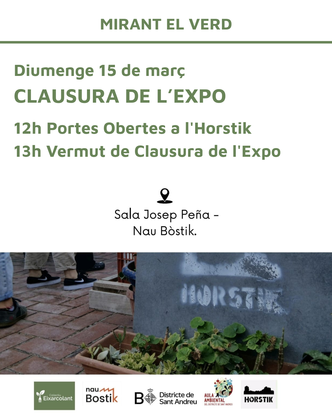 Data inici * dg., 15/03/2026 - 12:00 Districte i barri * Sant AndreuLa Sagrera Vermut de Clausura - Mirant el Verd Organitza Horstik En col·laboració amb Nau Bostik Diumenge 15 de marçCLAUSURA DE L’EXPO - Mirant el Verd12h portes Obertes a l'Horstik13h Vermut de Clausura de l'expo