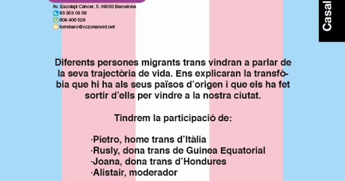 Diferents persones migrants trans parlaran de la seva trajectòria vital. Es realitzarà a CB Torre Baró a l'Av. d'Escolapi Càncer, 5. Com a ponents tindrem a Pietro (Itàlia), Rusly (Guinea Ecuatorial), Joana (Honduras).