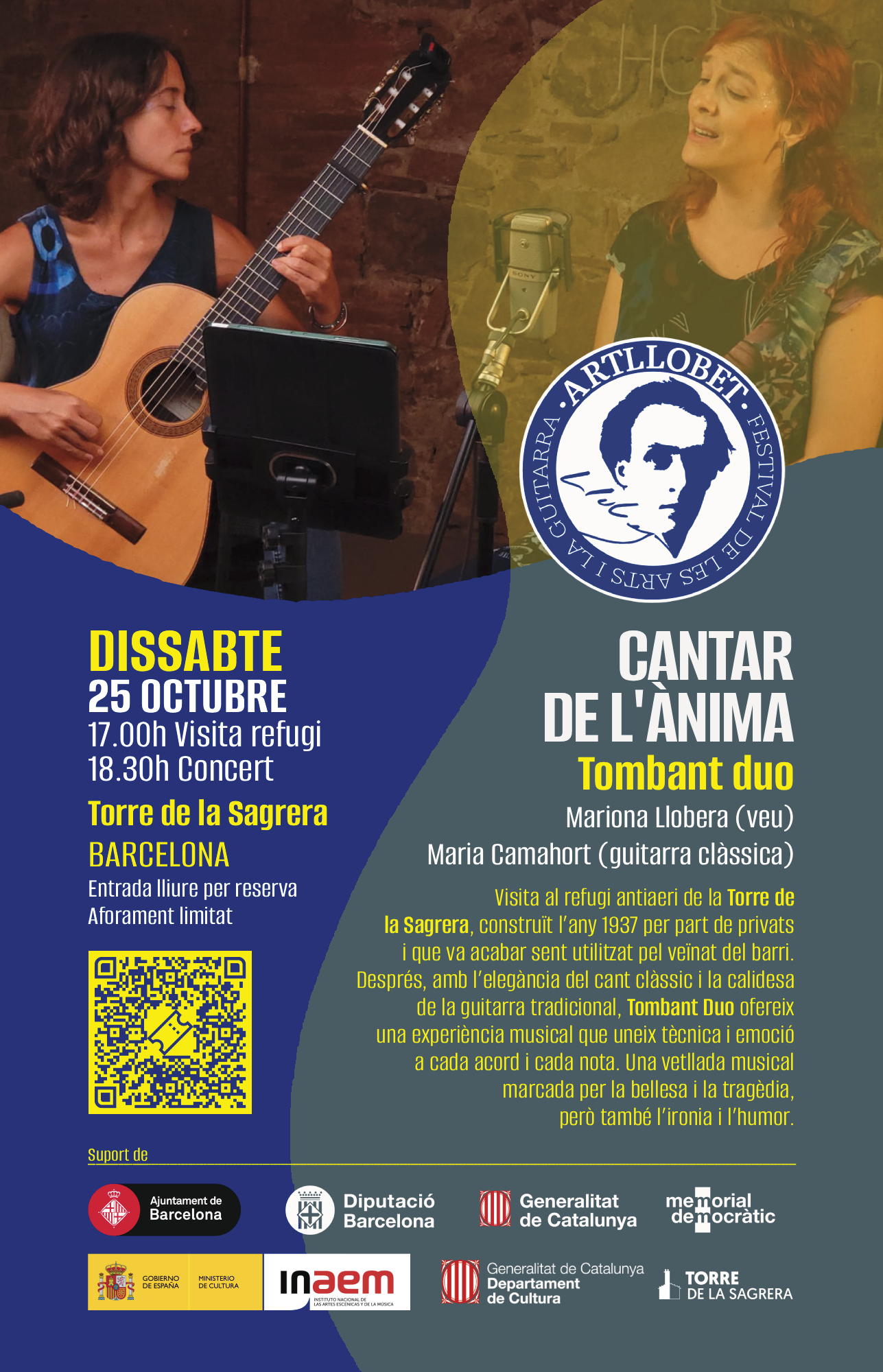 Visita al refugi antiaeri de la Torre de la Sagrera, construït l’any 1937 per part de privats i que va acabar sent utilitzat pel veïnat del barri. Després, amb l’elegància del cant clàssic i la calidesa de la guitarra tradicional, Tombant Duo ofereix una experiència musical que uneix tècnica i emoció a cada acord i cada nota. Una vetllada musical marcada per la bellesa i la tragèdia, però també l’ironia i l’humor.