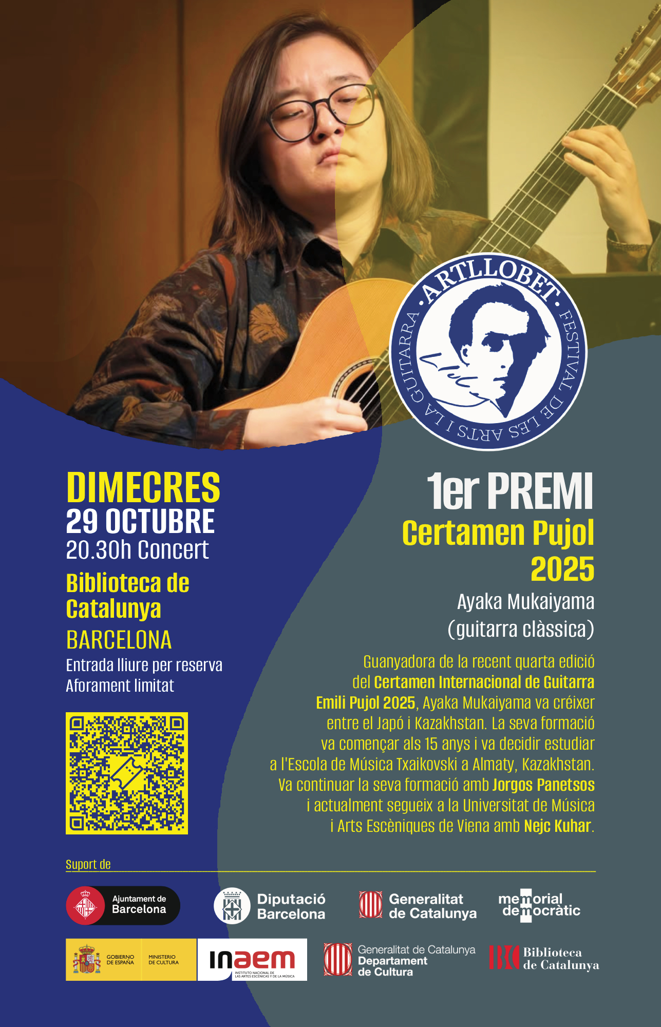 Guanyadora de la recent quarta edició del Certamen Internacional de Guitarra Emili Pujol 2025, Ayaka Mukaiyama va créixer entre el Japó i Kazakhstan. La seva formació va començar als 15 anys i va decidir estudiar a l’Escola de Música Txaikovski a Almaty, Kazakhstan. Va continuar la seva formació amb Jorgos Panetsos i actualment segueix a la Universitat de Música i Arts Escèniques de Viena amb Nejc Kuhar.