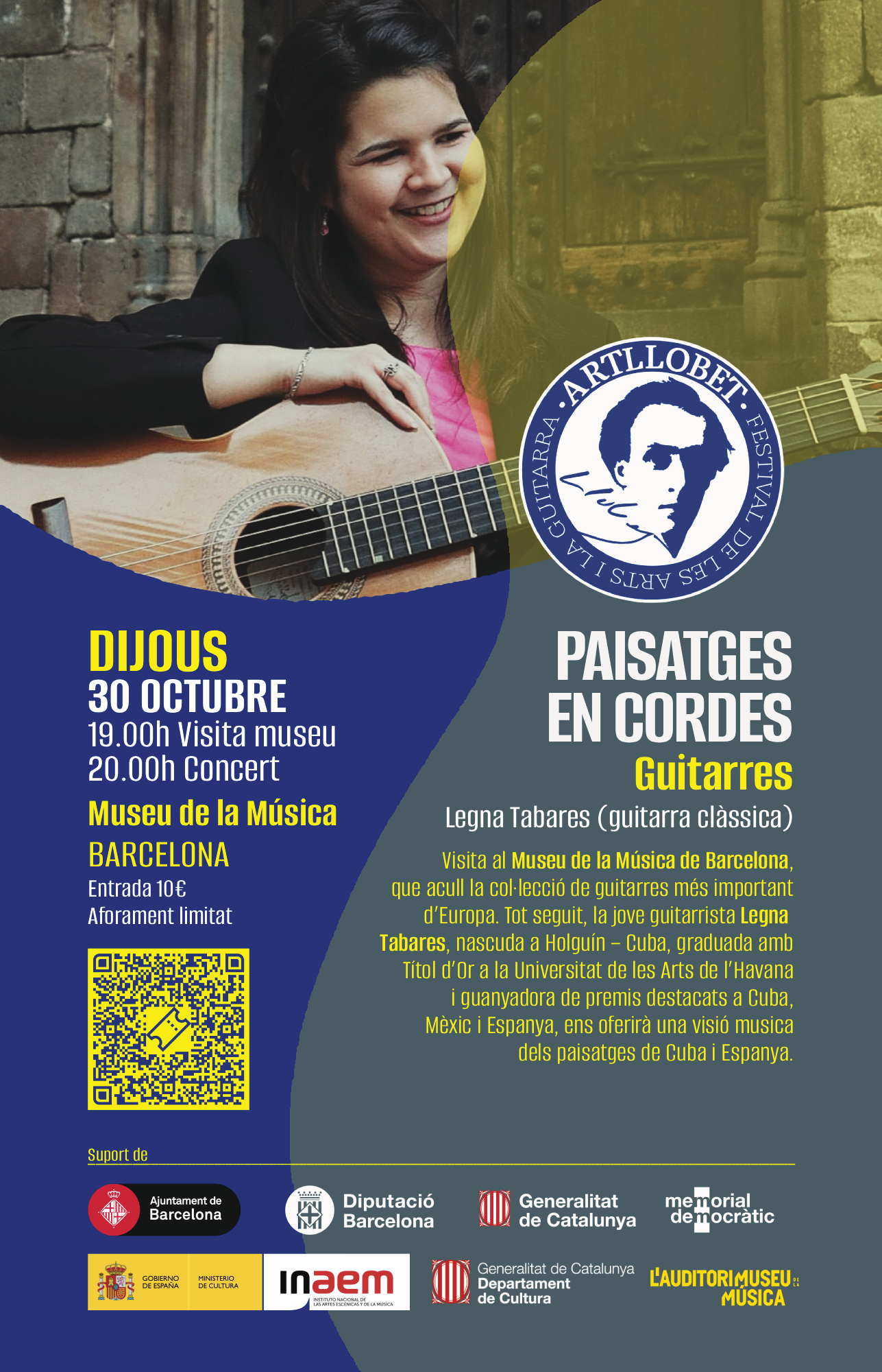 Visita al Museu de la Música de Barcelona, que acull la col·lecció de guitarres més important d’Europa. Tot seguit, la jove guitarrista Legna Tabares, nascuda a Holguín – Cuba, graduada amb Títol d’Or a la Universitat de les Arts de l’Havana i guanyadora de premis destacats a Cuba, Mèxic i Espanya, ens oferirà una visió musical dels paisatges de Cuba i Espanya.