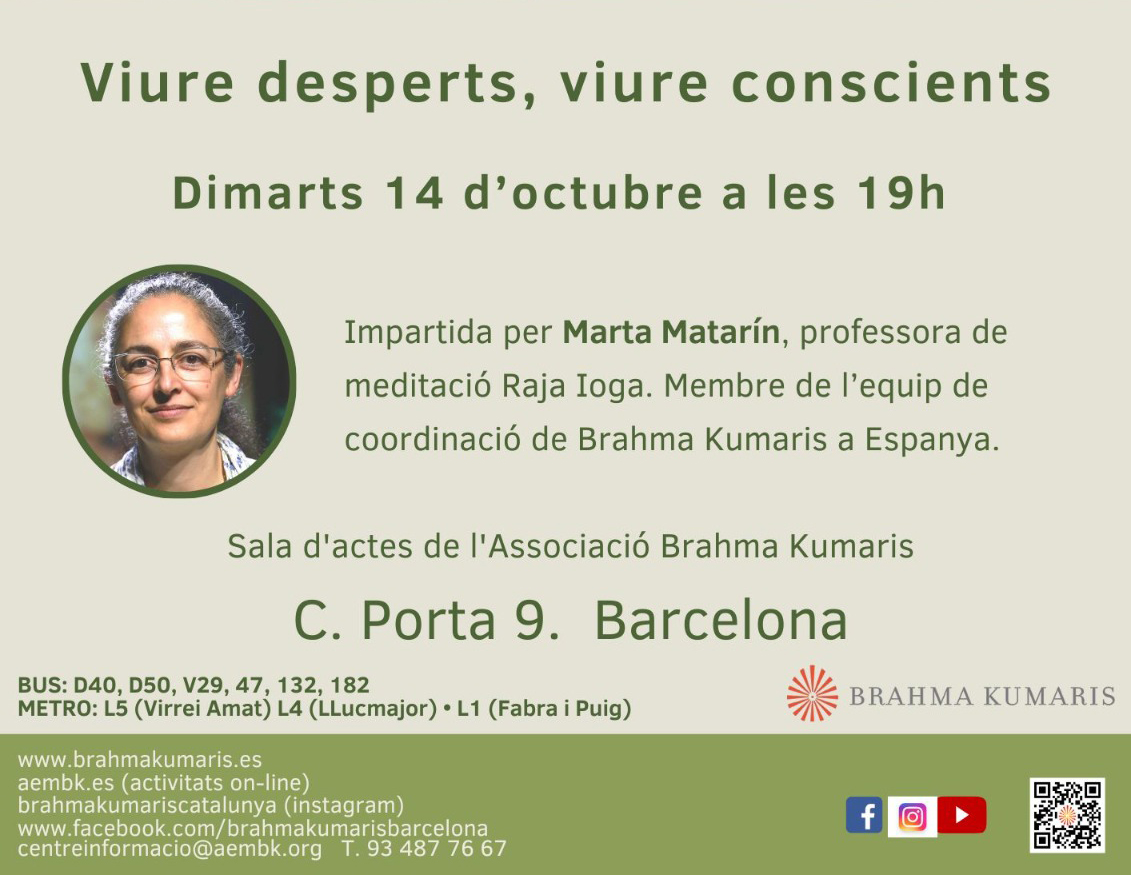 Data inici * dt., 14/10/2025 - 19:00 Districte * Nou Barris Conferència: Viure desperts, viure conscients Organitza Associació Brahma Kumaris Reflexió i meditació.