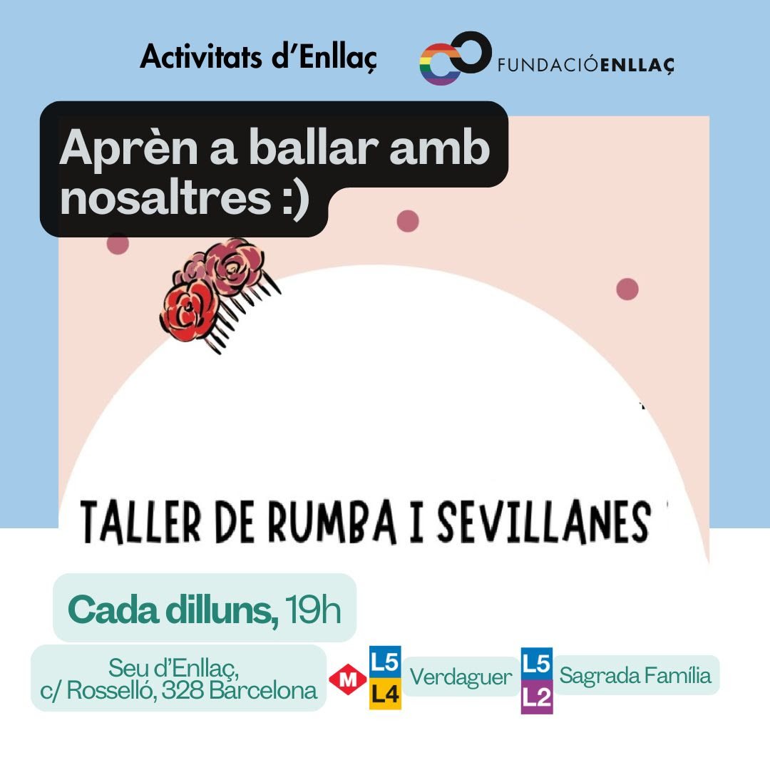 Data inici * dl., 20/10/2025 - 19:00 Districte * Eixample Taller de rumbes i sevillanes Organitza Fundació Privada Enllaç Vine a aprendre a ballar rumba i sevillanes amb nosaltres!