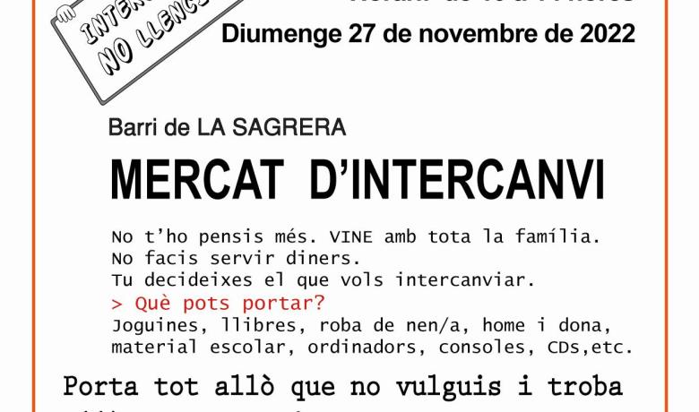 A la Sagrera, en canvi, sí que hauràs de portar alguna cosa per endur-te una altra. Al mercat d’intercanvi de la plaça Jardins d’Elx, diumenge hi podràs portar i trobar joguines, llibres, roba, ordinadors, jocs i consoles... gairebé qualsevol cosa que puguis imaginar. Només hauràs d’acordar què dones per emportar-te el que vols. Si fa no fa, com a la trobada d’intercanvi d’adhesius polítics i futbolers que s'organitza a Sants, al costat del parc de l’Espanya Industrial; un mercat tan singular i superespecialitzat que tindrà el seu vermut i selecció musical punk-skatalítica.